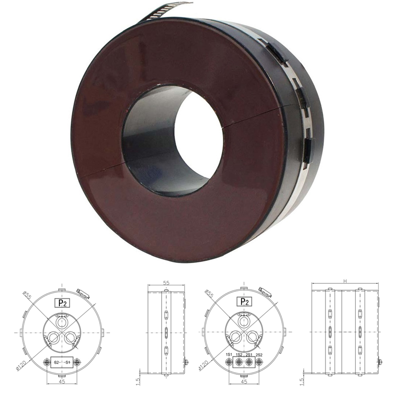 其半圓環(huán)型鐵芯和二次繞組采用優(yōu)質(zhì)環(huán)氧樹脂真空澆注在可阻燃的塑料殼體內(nèi),防潮濕,性能穩(wěn)定,無需維護。安裝時將兩個半圓環(huán)卡在分相電纜上,用抱箍抱緊,與電纜一體,和諧美觀,35mm2-400mm2 的 10kV 電纜均能適用,其抱箍采用優(yōu)質(zhì)不銹鋼材料,堅固可靠,無渦流。依據(jù)電流變比、準確級和額定負載的不同,該系列電流互感器分為以下幾種類型,